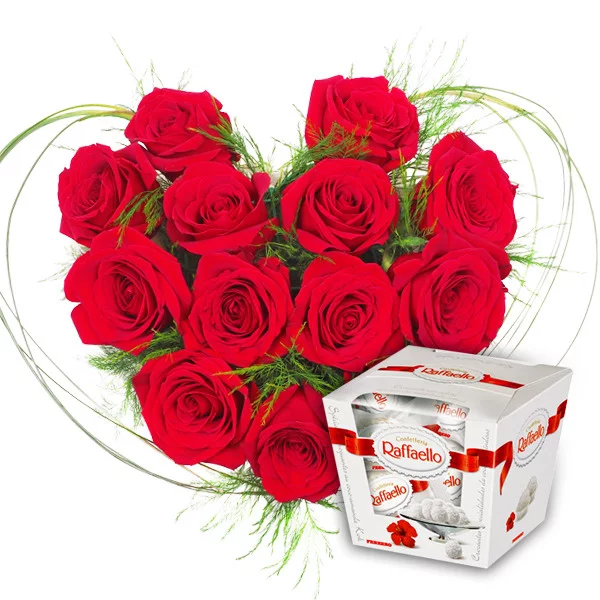 Стандартный (на фото): роза красная - 13 шт., декоративная зелень, берграс, оазис. + конфеты "Raffaello" - 1 шт.
