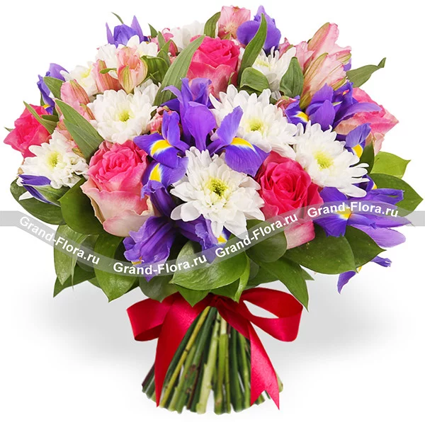 Уменьшенный: роза розовая - 3 шт., хризантема белая кустовая - 1 шт., альстромерия розовая - 1 шт., ирисы - 8 шт., декоративная зелень, лента.