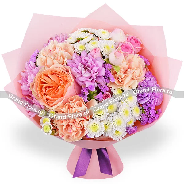 Уменьшенный: роза персиковая - 1 шт.,гвоздика персиковая - 3 шт., гвоздика фиолетовая - 1 шт., роза кустовая розовая - 1 шт., роза кустовая фиолетовая - 1 шт., хризантема кустовая ромашковая фиолетовая - 1 шт., хризантема сантини - 1 шт., статица, упаковка, лента. Примерный размер: 25Х25 см.