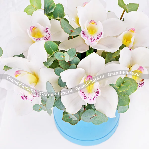 Стандартный: орхидея белая - 7 бутонов, эвкалипт, оазис, коробка. Примерный размер: 25Х30 см.
