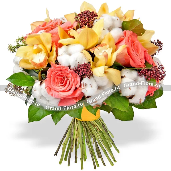 Люкс: роза коралловая - 15 шт.,орхидея желтая - 10 шт., декоративная зелень, хлопок - 9 шт., лента.