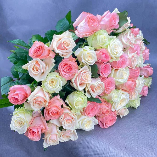 Роза белая (кремовая) и розовая 50-60 см - 51 шт , упаковка фетр.
